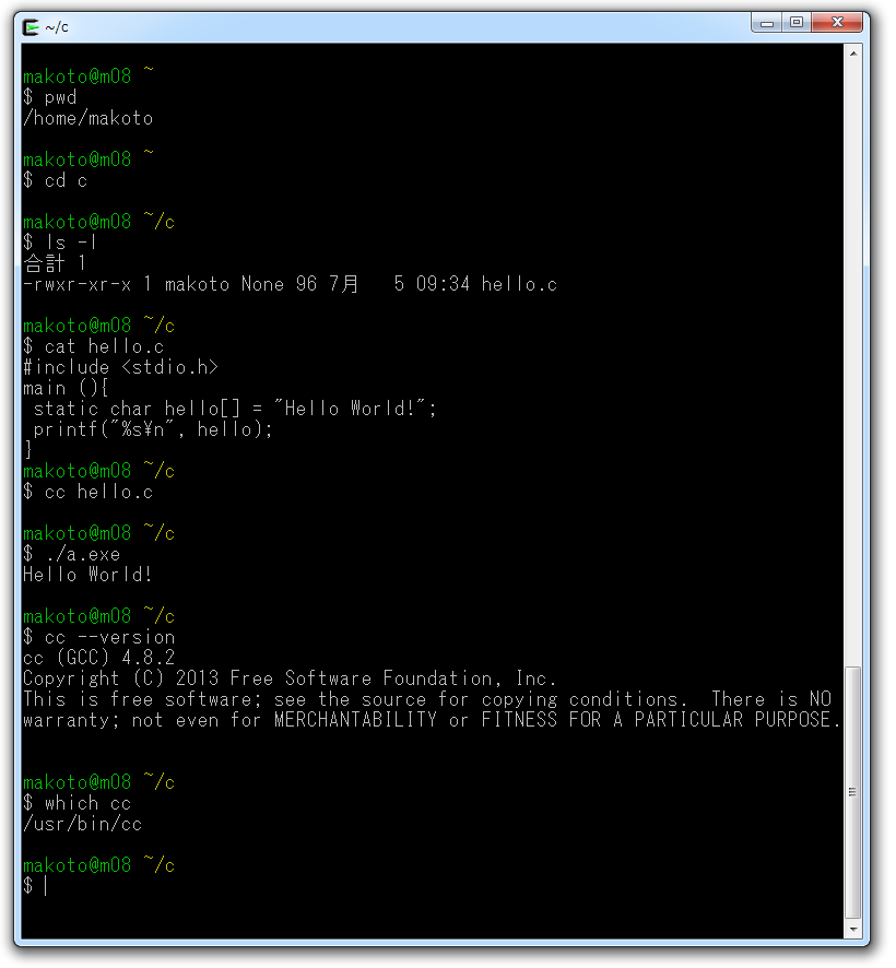 Cygwin64 Terminal の窓で、次のような文字を入力します。