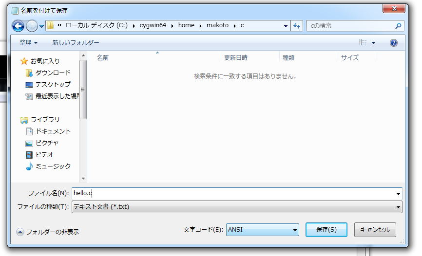 ファイル名の欄に hello.c と入力して「保存」を選びます。